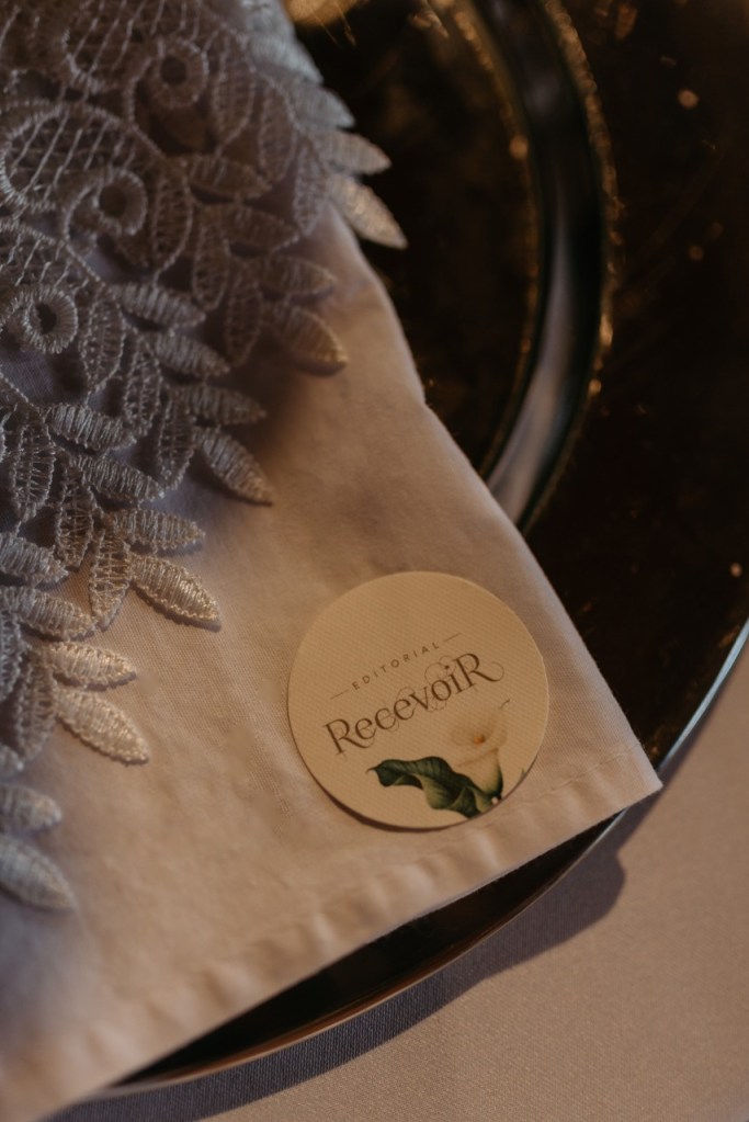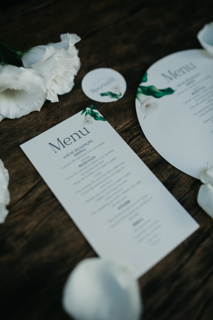 Pensamos nos menus de fundo de prato, os menus de mesa, tags e até nos rótulos de água. Sempre podemos usar e abusar da papelaria para deixar tudo mais personalizado possível para que o convidado possa sempre ser bem recebido e o melhor se sentir confortável.
